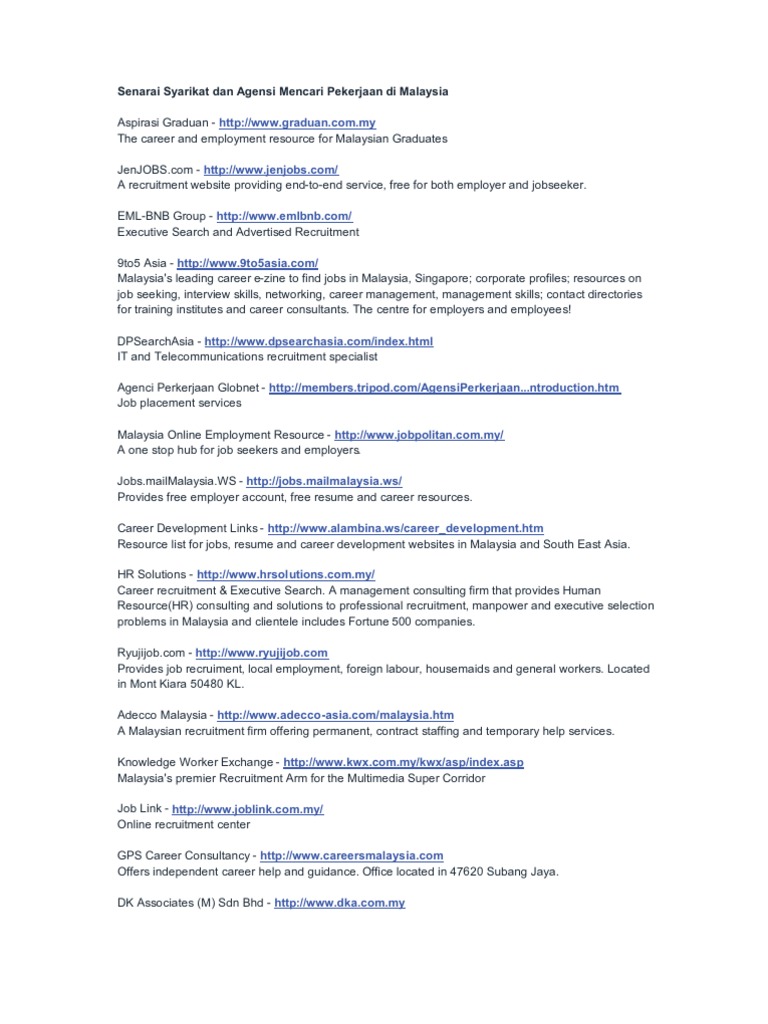 Senarai Syarikat Dan Agensi Mencari Pekerjaan Di Malaysia Recruitment Employment