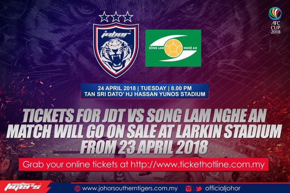 Johor Darul Ta Zim Football Club Tickets For The Afc Cup 2018 Between Jdt And Song Lam Nghe An Fc Will Be On Sale At Ticketing Counters From 9 00am On April 23 2018