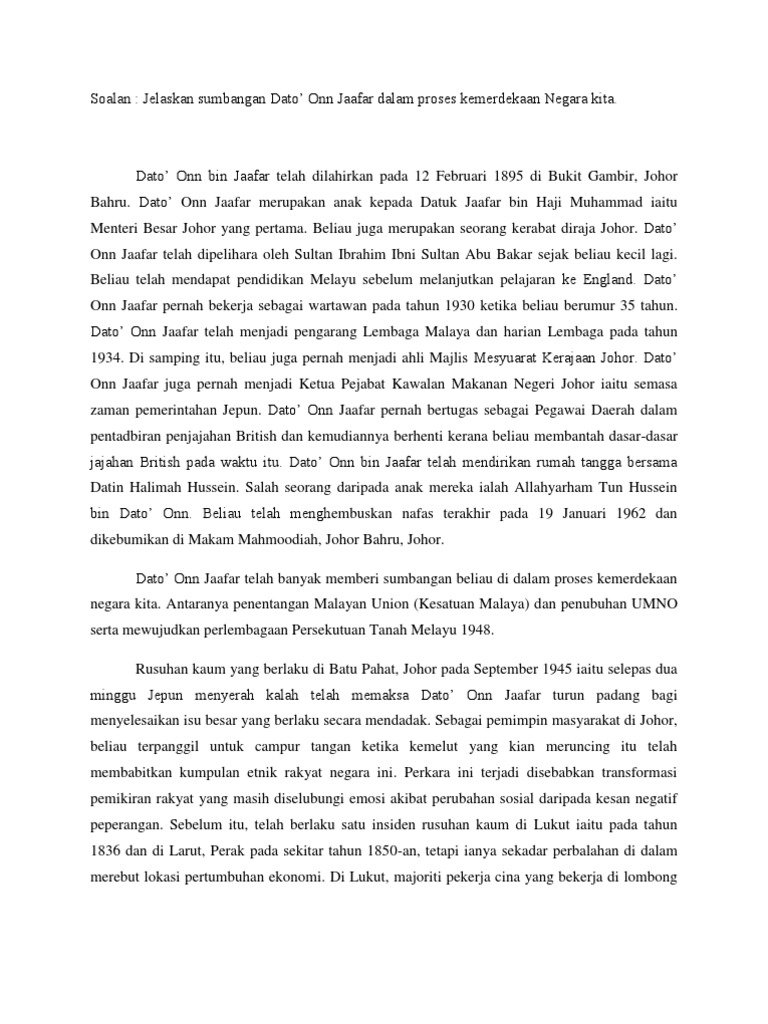 Doc Bincangkan Sumbangan Dato Onn Jaafar Dalam Memansuhkan Malayan Union Di Tanah Melayu Dari Tahun 1946 Hingga 1957 Docx Muhammad Amirul Academia Edu